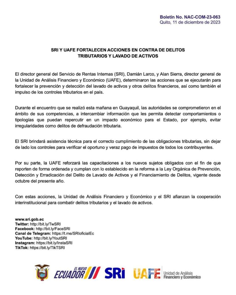 SRI Y UAFE FORTALECEN ACCIONES EN CONTRA DE DELITOS TRIBUTARIOS Y LAVADO DE ACTIVOS